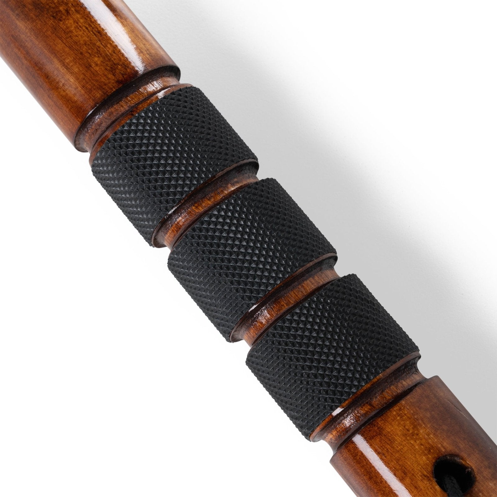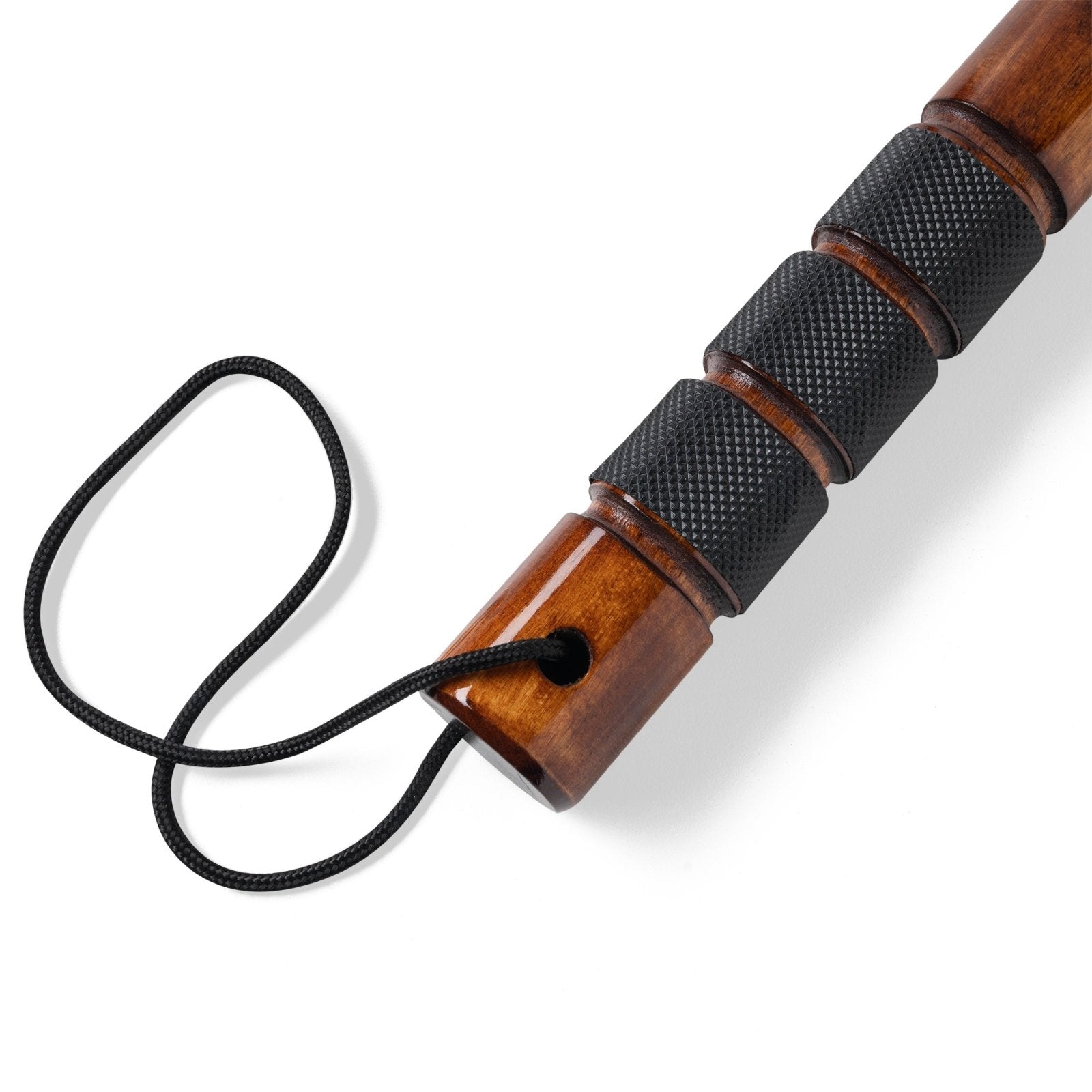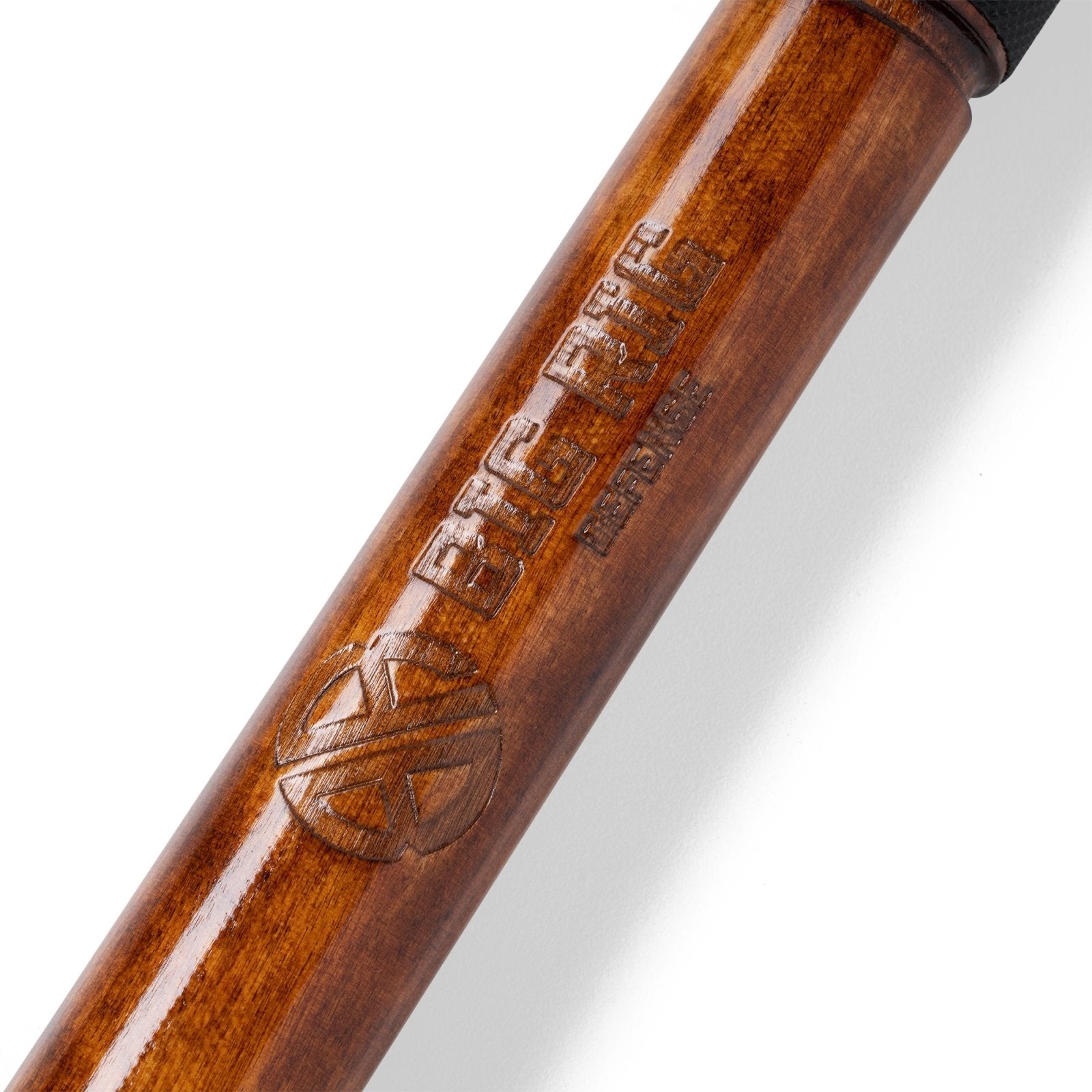 It's made of high-quality stained hickory and metal, offering durability and a premium feel. The handle is designed for a firm grip, even with gloves.